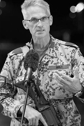 Mit der Waffe in der Hand: Das sieht man in D nicht oft, dass ein deutscher General mit dem schussbereiten Sturmgewehr zu den Reportern im Inland spricht. So gestern Brigadegeneral Jens Arlt, der die übers Knie gebrochene Afghanistan-Aktion der Bundeswehr kommandierte, von der er zurück ist.