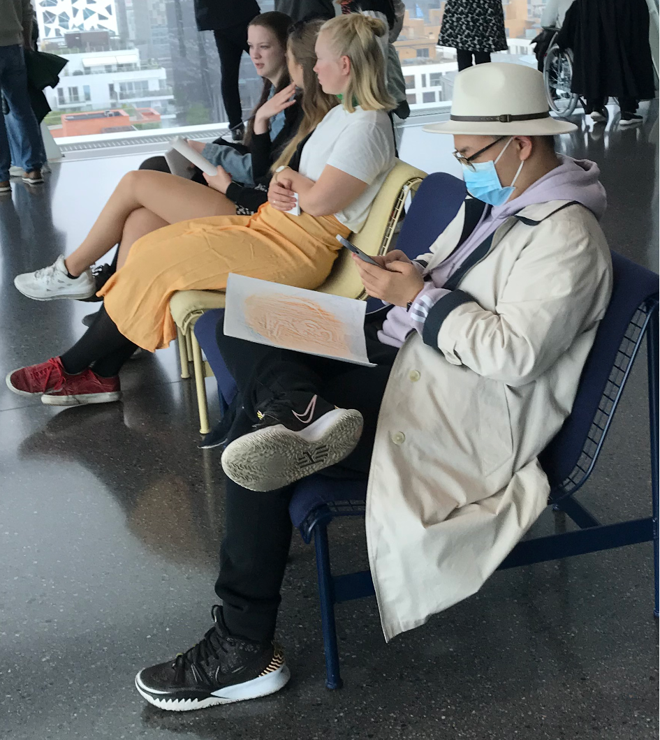 Munch (4): Da sich das Gebäude ab der neunten Etage nach vorne neigt und die Glaswände bis zum Fußboden reichen, treten alle Besucher nur zögernd bis an den Rand vor. Ich ertappe mich dabei, wie ich den Arm ausstrecke, ob das vor mir nicht das Nichts ist. Leute mit Höhenangst erkennt man daran, dass sie spätestens hier der Fensterfront peinlich fern bleiben.