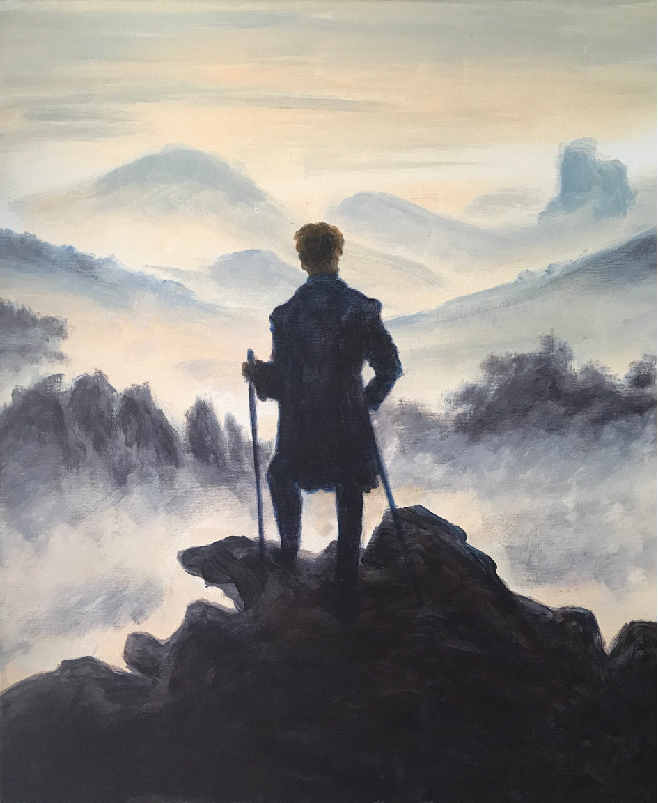 Na klar, sagt der Kunstfreund, das ist Caspar David Friedrich, und der hängt… na sach ma schnell. – Nein ist er nicht, sondern „Friedrich“ von Bernd Zeller, und der hängt, wenn ich vom Schreibtisch hochkucke in meinem Blickfeld. Dort ist er hingeraten, weil ich ihn für ein Buchcover nutzen wollte, nämlich für „Denken ohne Geländer“.