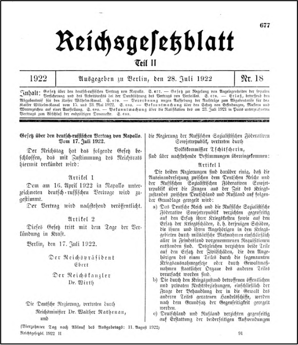 Wie vereinbart, so getan. In Moskau und in Berlin öffneten wieder die jeweiligen Botschaften, Handelsvertretungen traten hinzu und – unter der nicht allgemein zu bemerkenden Oberfläche – lief die militärische Zusammenarbeit beider Statten zu gegenseitigem Nutzen an. Russlands Rote Armee erhielt taktisch-strategische Aufbauhilfe und die Reichswehr Übungsgebiete für die vom Versailler Diktat verbotenen Waffen (Panzer, Flugzeuge, Giftgasmunition).