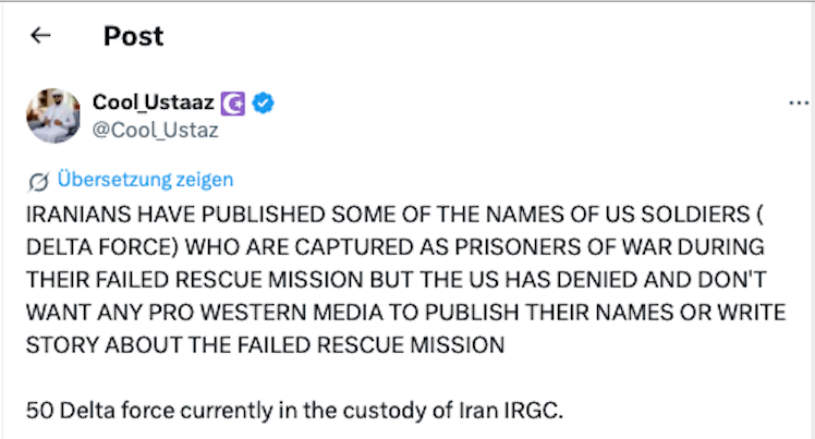 Die Perser holten gestern ein US-Kampfflugzeug, das sich in ihren Luftraum vorgewagt hatte, vom Himmel. Damit wäre auch das geklärt, wie es um die amerikanische Luftherrschaft in Nahost bestellt ist, während nur in der Lufthoheit über den US-Propaganda-Stammtischen das Gegenteil stattfindet. Derzeit läuft eine Jagd nach dem zweiten Piloten, nachdem einer der beiden in einer vermutlich gemeinsamen israelisch-amerikanischen Aktion aus dem Südiran gerettet werden konnte. Noch hat den zweiten keine der beiden Kriegsparteien entdecken können. Wir wüssten sonst davon.