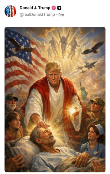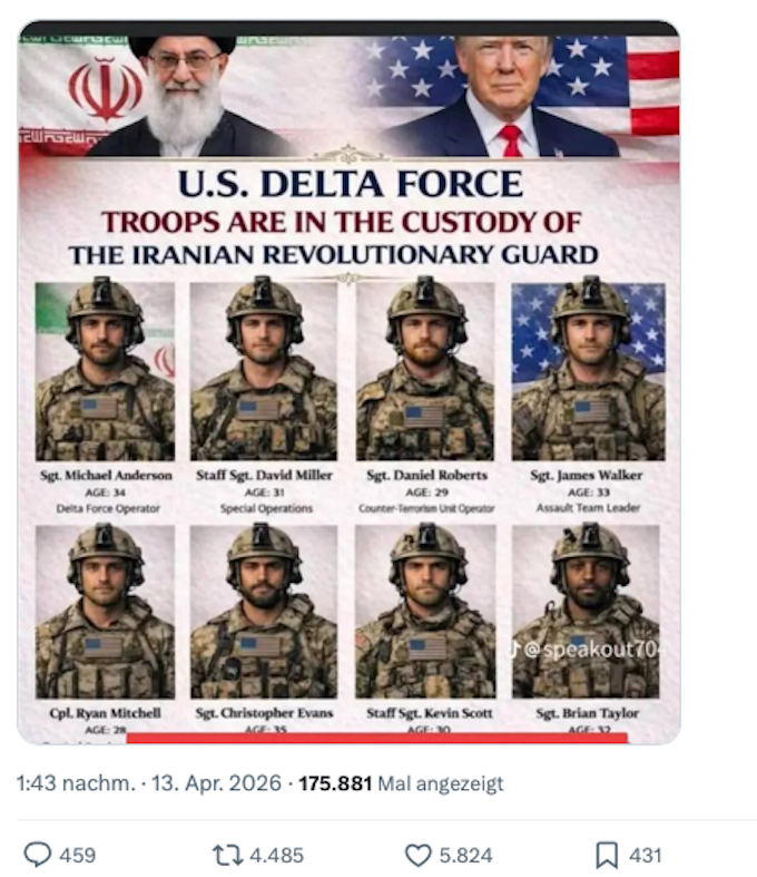 Lügen (3): Im Netz kursieren Bilder, die man kaum glauben kann. Das eine betrifft 50 US-Kommando-Soldaten, die mit Portrait, Namen und Dienstgrad, der Öffentlichkeit als persische Kriegsgefangene präsentiert werden. Kann sein, dass das zutrifft, eine Bestätigung aus dem Pentagon steht noch aus. Das andere Bild ist noch weniger wahrscheinlich, denn es zeigt Trump auf seinem Account als Gemälde in der Rolle des Messias. Ich will nicht glauben, dass das von ihm selbst stammt. Falls doch, ist er reif für die Klappsmühle.